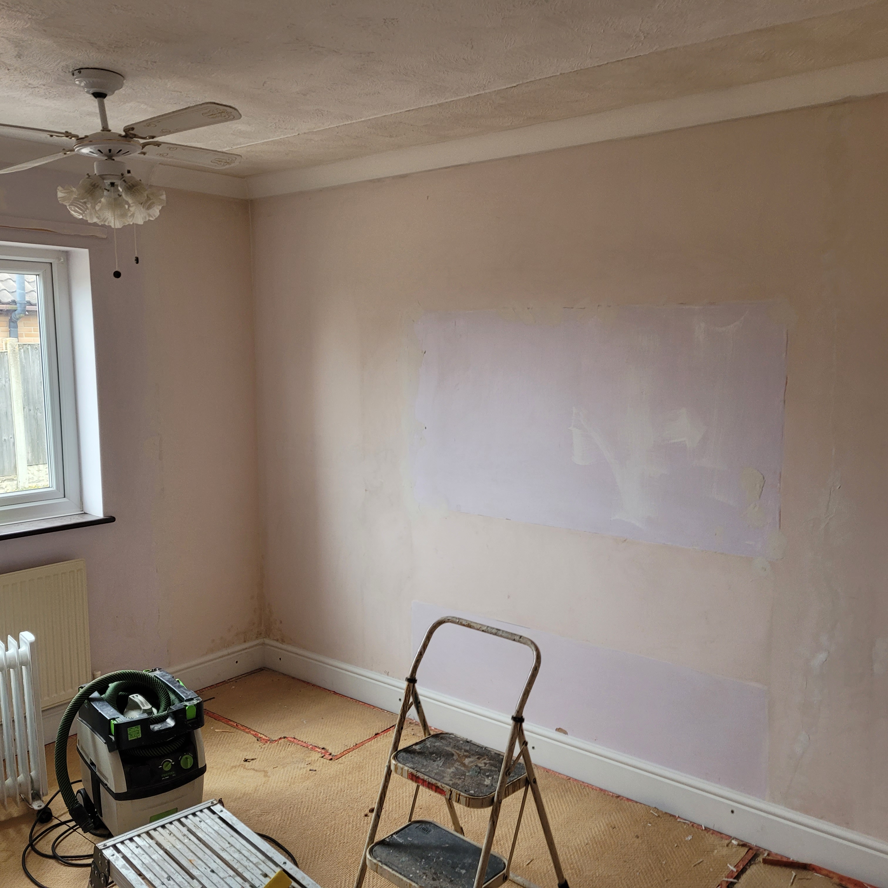Preparation is key, and Mark paid great attention to that, in particular filling cracks/gaps, treating (prior to painting) areas of the walls that appeared to have suffered from poor circulation (damp), and in two bedrooms floor to ceiling wardrobes had been recently removed, which had left a mess along the ceiling which he repaired and now can’t be seen!. He also successfully repaired (filled and sanded) some skirting boards which had also been damaged. Mark has a fantastic vacuum gadget that attaches to his sander so all the mess from sanding is vacuumed away as he works – that was a huge bonus for me!