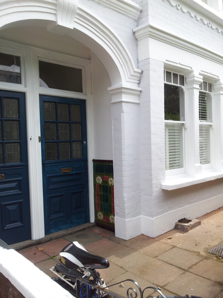 This project involved a lot of masonry repairs. The doors had previously been painted without prior sanding. They had to be stripped to the bare wood before priming and painting again. The client was going to paint the brickwork yellow again but I suggested going for less standard colours. We used ‘blackened’ by Farrow and Ball for the brick work.